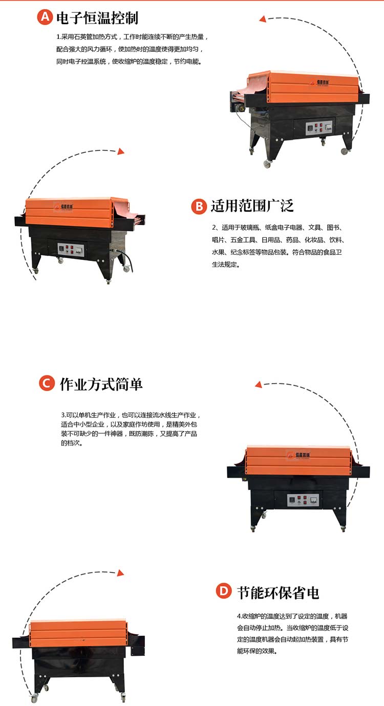BS-4535熱收縮膜包裝機采用下循環式熱風結構,爐道高度可自由可調節,兩側百葉風門可調,配置智能溫控,交流調速,鐵氟籠傳送帶或滾筒式傳送帶,廣泛應用于食品、日化、醫藥、機械等行業,用于產品的單一、集合或組合包裝。包裝案例如下: