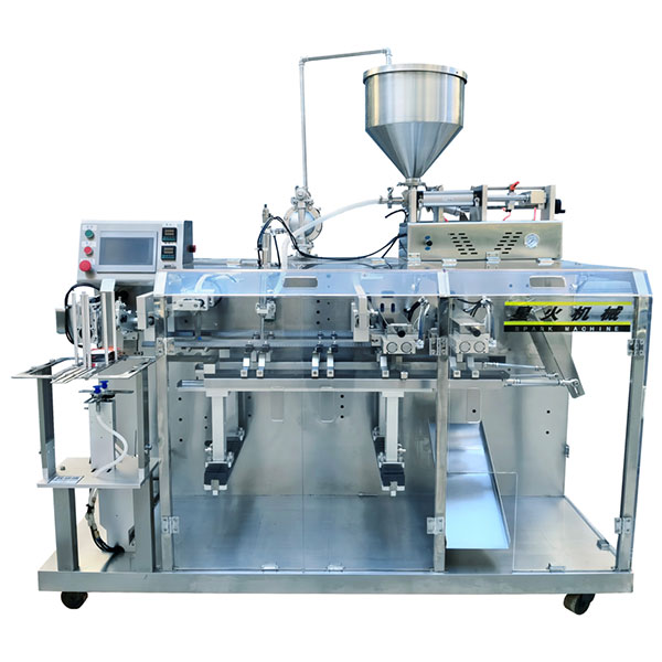 全自動水平式給袋包裝機是包裝類似方便食品調料包袋型樣式可設計為三邊封或背封,包裝材質多為單層或多層復合薄膜。食品調味料多趨向于多品種小批量生產,可以根據物料特點、包裝規格選擇相應的包裝機型。袋裝液體自動包裝機采用蠕動泵計量,物料輸送管道一端與料桶相連一端深入制袋模具中,整個包裝過程中液體產品不與設備接觸潔凈衛生,可用于醬油、生抽、食醋、調味油等產品的定量包裝。大袋液體膏體的包裝需要采用活塞泵計量,袋型多為背封袋,如番茄醬、芥末醬、花生醬、芝麻醬等膏體醬料。