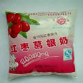 本包裝件適用于醬油、醋、果汁、牛奶等液體,采用0.08mm聚乙烯薄膜,其成型、制袋、定量灌裝、油墨印字、封口切斷等過程全部自動進行,薄膜在包裝前進行紫外線消毒,符合食品衛(wèi)生的要求。